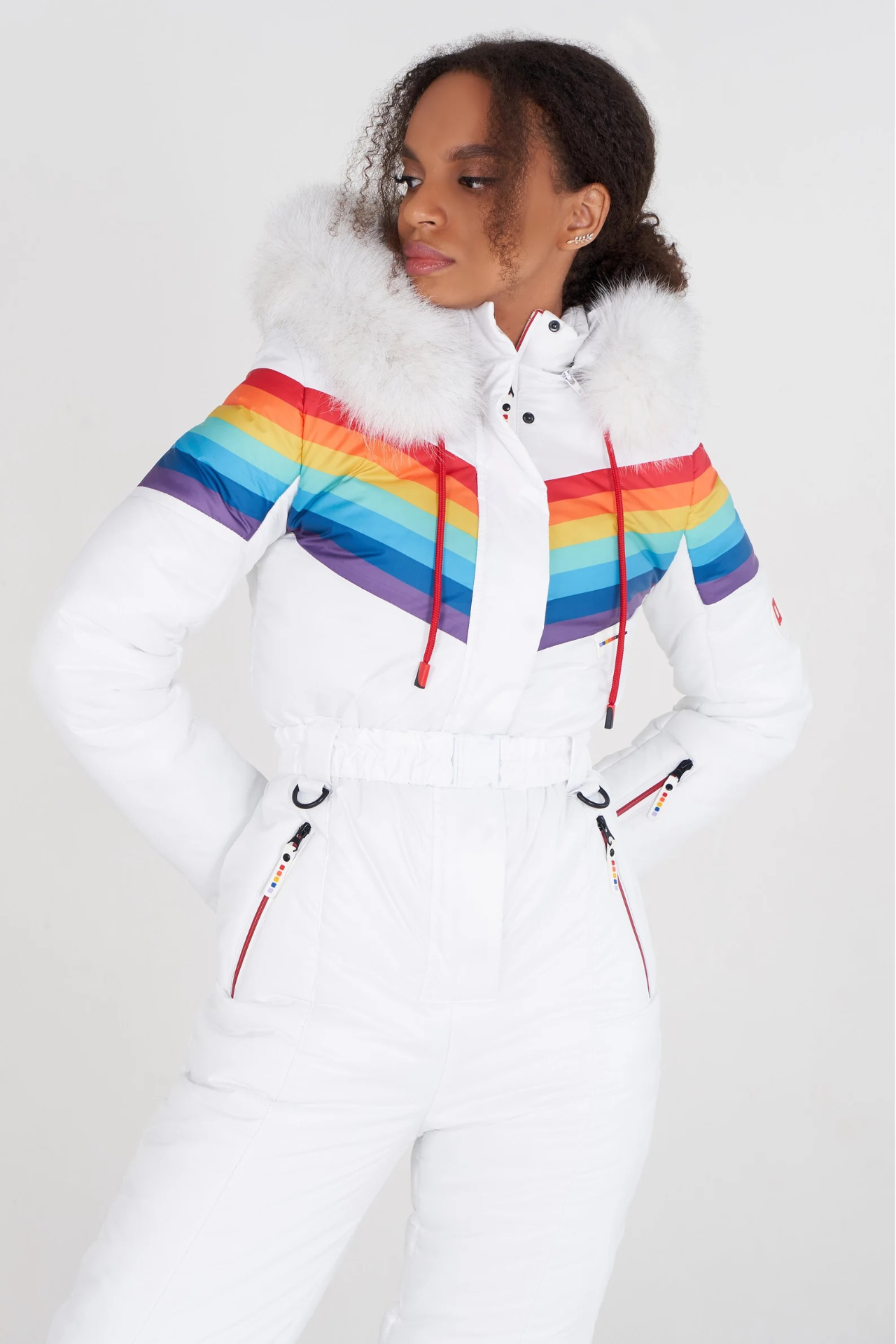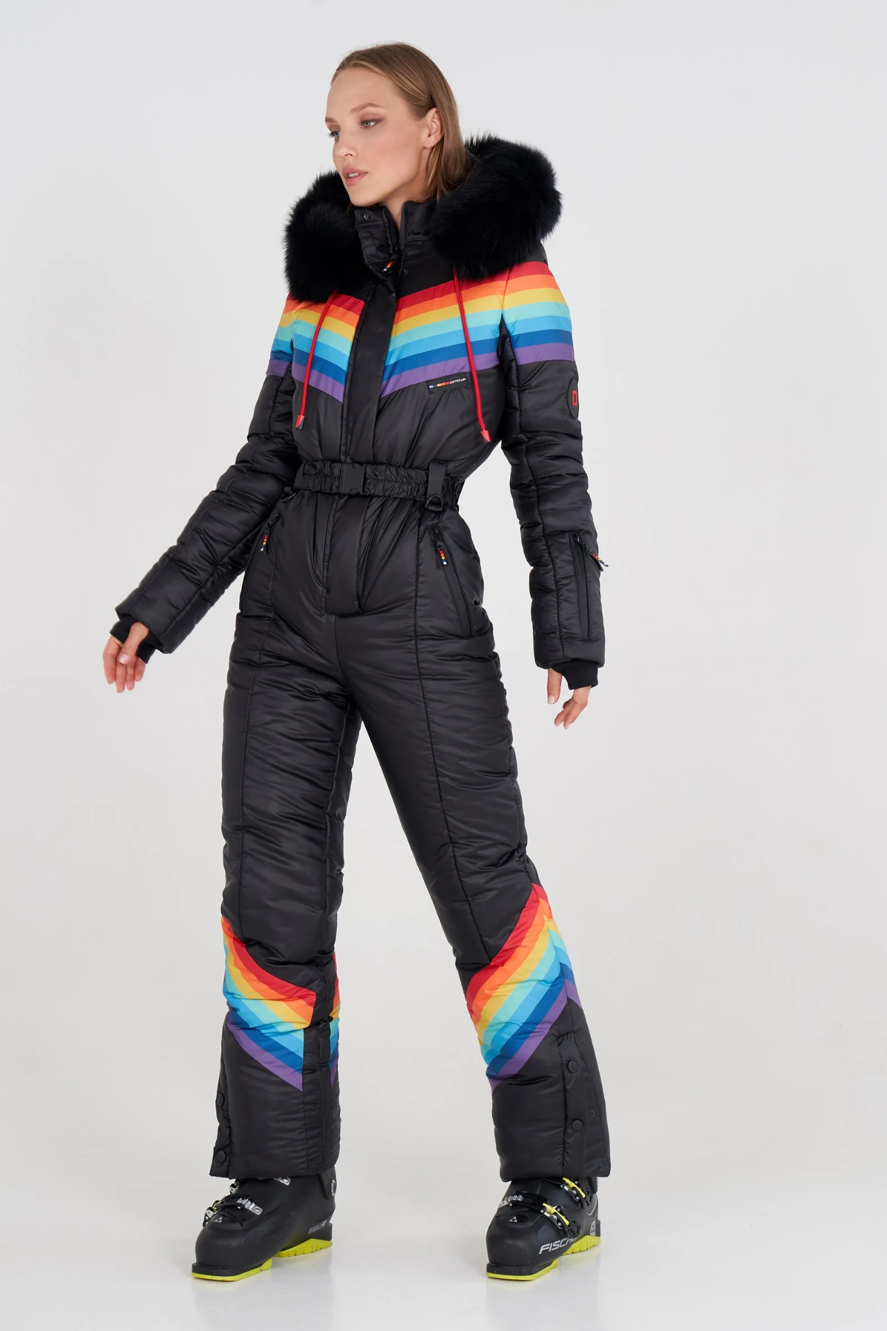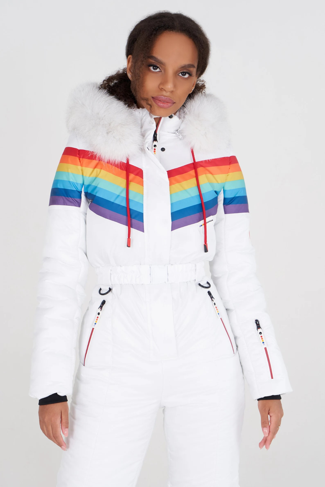 Tato dámská kombinéza zdobená jasnou duhou je ideální pro chladné zimní dny.